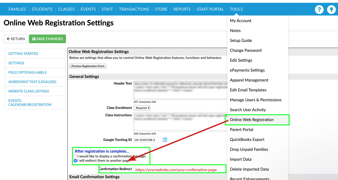 - In the main blue navigation at the top navigate to “Tools” > “Online Web Registrations”